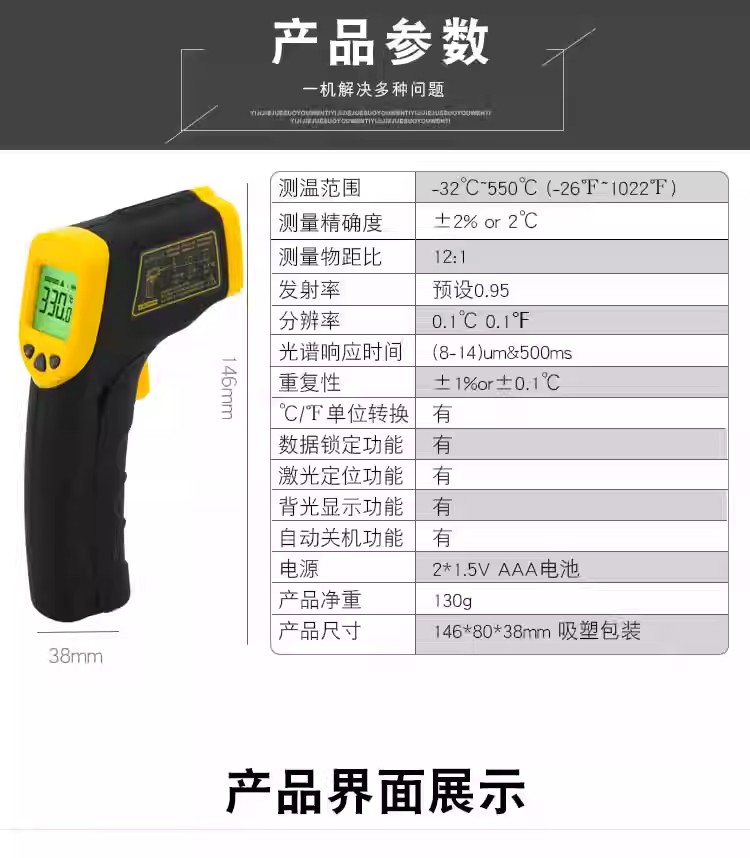 测温范围-32℃~550℃ (-26℉~1022℉) 测量精确度±2% or 2℃