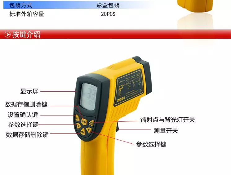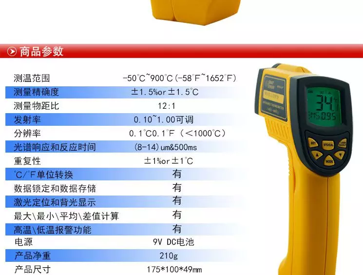 测温范围-50℃~900℃(-58℉~1652℉) 测量精确度±2% or 2℃