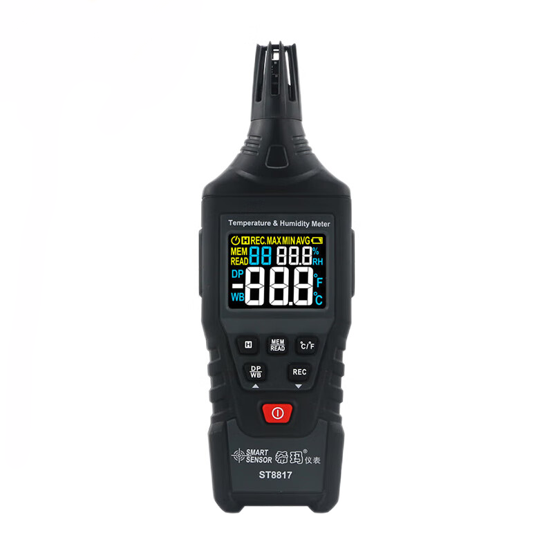 温湿度计是用于测量溫度及水分在大气中的含量。快速、方便、精确地测量空气中的湿度和温度读数。湿度测量仪器通常依靠如温度、压力测量、质量、机械或电气变化的物质中的水分吸收量來测量湿度,再通过校验和计算來獲取湿度测量数據。现代电子设备中使用电变化电容或电阻测量湿度的差异。应用在实验设备、工业、工程生产和专业用途,都是一个理想的湿度和温度计量器。